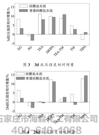 三乙醇胺-TM使水泥的3d抗压强度提高10%左右,28d抗压强度变化不大,有明显的早强作用。DEIPA可以同时提高它们的早期强度和后期强度,而且两类水泥的增强幅度相差不大。