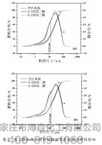 从图2体积微分布曲线来看,丙二醇和丙三醇可以显著增加13μm以下的各级细颗粒数量,减少13μm以上的各级颗粒数量。从累积分布曲线可以看出,它们使水泥向细颗粒区域平移,表现出良好的助磨效果。此外,丙二醇(或丙三醇)的掺量从0.02%增加至0.03%,水泥粒径分布的变化较小,进一步说明它们的饱和掺量点在0.02%~0.03%范围内,与比表面积和筛余的分析结果一致。