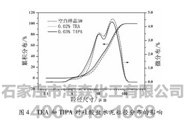 如图4所示。从微分布曲线来看,TEA和TIPA明显增加了10μm以下的细颗粒,减少了粗颗粒。它们使水泥颗粒累积分布曲线向粒径尺寸较小的区域移动,说明水泥颗粒整体变细,助磨效果较好。TIPA粉磨的水泥细颗粒比TEA多,整体细度也比TEA小,表明TIPA比TEA助磨效果好,与比表面积和筛余的分析结果一致。