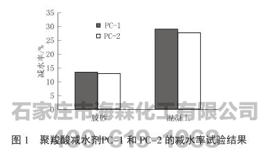 聚羧酸减水剂的减水率试验结果,减水剂的折固掺量均为0.13%。表1为2种