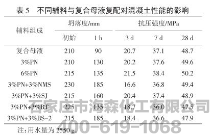 以上试验结果表明,复合母液[m(PC-2)∶m(PC-1)=3∶7]复掺3%PN和3%BS-2对水泥净浆的协同分散和保塑作用最佳,本试验采用混凝土试验对其进行验证,同时以单掺PN和复掺其它辅料作为对比,试验结果见表5。