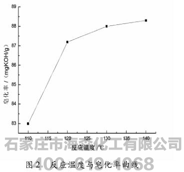 三乙醇胺按1.21(mol/mol)加入三口烧瓶中,加热搅拌,分别控制在不同的反应温度下反应2.5h,停止加热,保温15min,降温至50℃以下。取2份反应液体试样,分别测其酸值和皂化值。扣除酸值后的皂化值与反应温度之间的数据见图2。