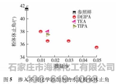 DEIPA等三链烷醇胺类化学添加剂被作为助磨组分加入水泥粉磨过程中,通过平衡价键而被逐渐吸附于颗粒表面,并在水泥颗粒表面形成吸附膜。粉末颗粒之间吸附薄膜的存在,减小了水泥颗粒间的范德华力与静电引力,同时水泥颗粒间的接触面积也相对减小。这有利于粉体颗粒之间的相对滑动,从而提高粉体的流动性并降低休止角。链烷醇胺是一种极性有机物,其在水泥粉体颗粒表面的吸附是一种液固相界面间的吸附行为,吸附能力的大小与其本身的偶极距有关。