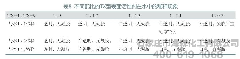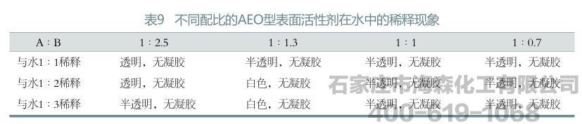 从表8、9发现,TX类的表面活性剂中,若TX-4的比例增大到一定值时,则出现了凝胶现象,而AEO表面活性剂则没有出现这种现象。因此,选择和控制好表面活性剂合适的比例,则能够避免清洗剂遇水成凝胶的现象。