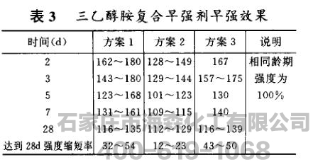 三乙醇胺早强效果见表3。表2方中1~7号外加剂使用应注意后期强度稍稍降低。所以在混凝土施工时,标号应比原设计标号提高约20%。
