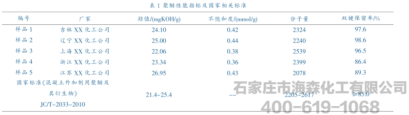 (1)在相同的合成工艺条件下,采用符合国家标准的不同厂家的TPEG聚醚所制备的