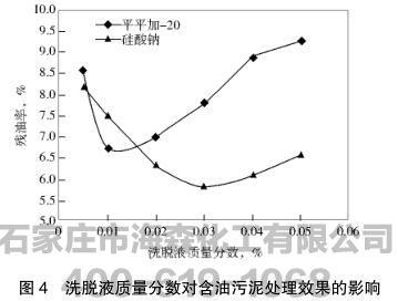 平平加-20和硅酸钠这两种试剂与水洗涤含油污泥时残油率都逐渐减小,且曲线下降趋势较为明显,这表明洗涤效果逐渐提高。在6︰1时达到最低点,此时洗涤效果最好。在2︰1~5︰1时,残油率逐渐减小,处理效果逐渐增加。至6︰1之后,随着液固质量比的增加,残油率有所升高。从图中曲线还可以看出,在此条件下硅酸钠的洗涤效果好于