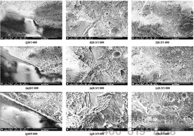 将混凝土中骨料和水泥浆体界面结合的情况用扫面电镜在不同放大倍数下进行拍照,得到图3,图3中:“/”前面的数字表示增韧剂掺量(%),“/”后面的数字表示放大倍数。