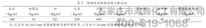 根据性能及施工要求,采用密实骨架堆积理论设计高韧性低收缩混凝土的配合比,如表7所示。