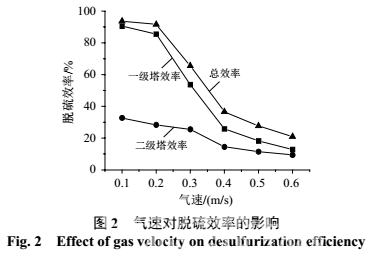 图 2 是气速对脱硫效率的影响,其试验条件为FNO2/FNOx 为 6.8%,SO2 体积含量为 1 000´10-6,尿素含量为 10%(质量比),