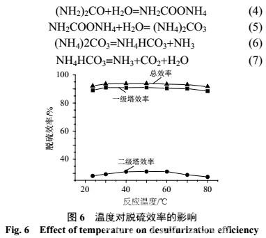 三乙醇胺含量为 0.01%(质量比),气速为 0.1 m/s, 液气比为 16 L/m3 下得到的结果。图 6 结果显示, 常温下(24.5 ℃)的脱硫效率(92.1%)略小于 30 ℃时的脱硫效率(93.6%),这可能是因为温度较低时,单位体积内活化分子的数量较少,反应速率较低,导致脱硫效率也较低。而反应温度在 30~70 ℃之间时, 脱硫效率均在 93%以上,基本保持不变;当反应温度达到 80℃时,脱硫效率略有降低,这是由于温度过高会使尿素的水解反应速度加快,使尿素水解生成 NH3,反应如下: