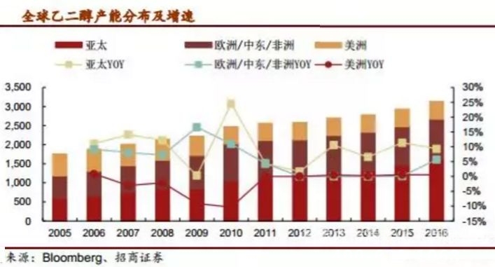2016年全球乙二醇产能2137万吨,产量2651万吨,整体开工率84.8%,近10年全球乙二醇消费增速约4.67%,整体开工率82~88%之间波动。我国、中东是近几年全球乙二醇产能增长的主要地区,未来我国和美国将成为乙二醇产能的主要增长地区。我国占全球乙二醇消费量的50%,产量占比仅24%,中东产量占比30%,而消费占比仅4%,产销的极不平衡导致全球乙二醇贸易量占总消费量的比例达到35%,我国和中东分别为最大的进口和出口地区。