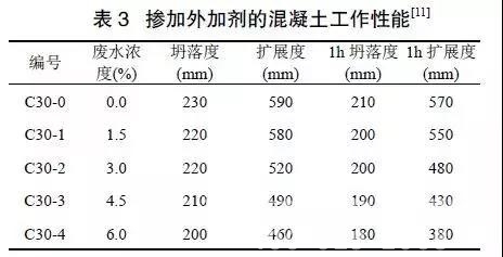 泥对聚羧酸减水剂的吸附机理目前存在较大争议,主要由竞争吸附和插层吸附两种观点。泥含量对聚羧酸减水剂的影响较为显著,学者也做了大量研究工作。蔡心映测试了砂中不同含泥量的水泥胶砂减水率,当含泥量超过 5% 时聚羧酸减水剂失去减水作用,经时损失也较大。程勋的研究发现集料中泥或泥块含量的增加使得混凝土初始坍落度和扩展度下降,同时经时工作性能降低,且含泥量超过一定范围,新拌混凝土失去流动性,聚羧酸减水剂失去应有的减水和保坍效果,随着混凝土强度等级提高,含泥量对掺聚羧酸减水剂混凝土性能影响越大。王军等同样认为当含泥量超过 3%时,混凝土坍落度影响显著,当含泥量达到 5%,混凝土干硬、无流动性,当泥含量 10% 时,混凝土拌和困难,失去混凝土应有的胶凝性和强度。唐盛轩对粘土矿物对聚羧酸减水剂的影响进行了分类,认为高岭土对混凝土影响大于伊利土和蒙脱土,应进行区别对待。污水中的泥同样对聚羧酸减水剂造成不同程度的影响,穆建明等研究了废水浓度对混凝土工作性能、力学性能等的影响,认为需要对拌和用水中的固含量进行控制(见表 3)。