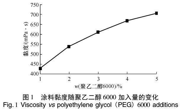 聚乙二醇 6000 加入量对涂料黏度( 20 ℃ ) 的影响见图 1。可以看出,涂料黏度随