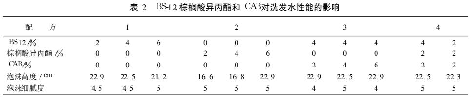 在加入一定量的 BS-12、CAB或棕榈酸异丙酯 3种助表面活性剂中的任何一种后, 泡沫稳定性、细腻度、稠度有较明显的变化 ,具体影响如表 2。