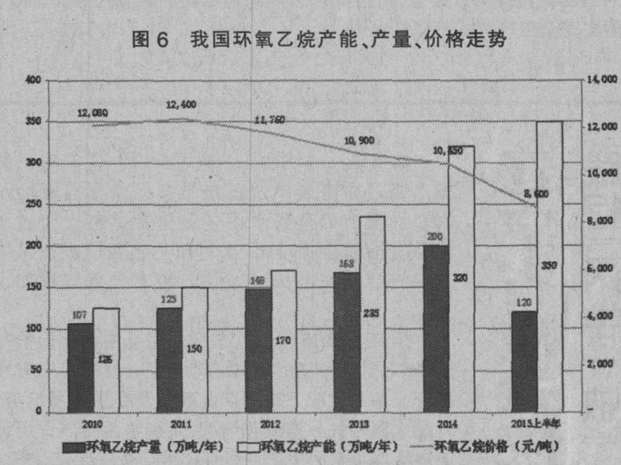随着近年来环氧乙烷产能的增加以及市场供应渠道的多样化,环氧乙烷的价格也逐年下跌。 2010 年全年,其价格是 12080 元/吨,而 2015 年上半年,环氧乙烷的均价为 8600 元/吨,价格下跌 29%左右(见图 6)。