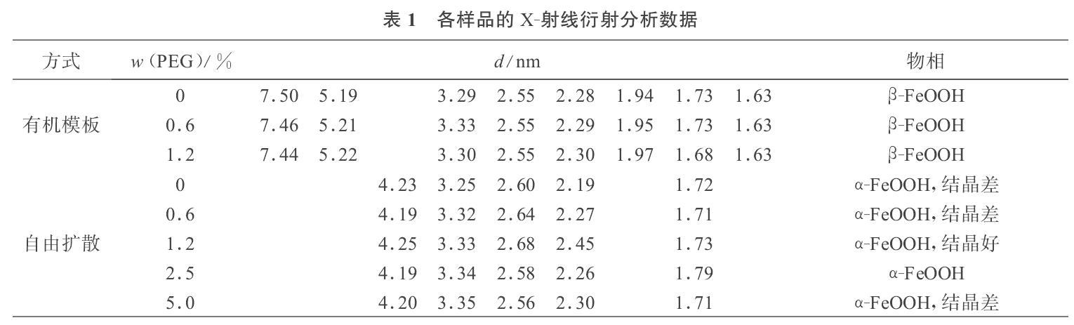 聚乙二醇后,β-FeOOH或α-FeOOH都有一定的结晶程度,这说明