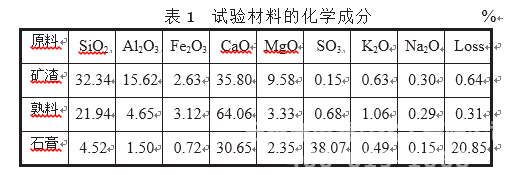 矿渣:济源钢铁厂水淬矿渣。熟料:黄河同力水泥有限公司提供的水泥熟料。 石膏:山西潞城产石膏。矿渣、熟料和石膏的化学成分见表 1。