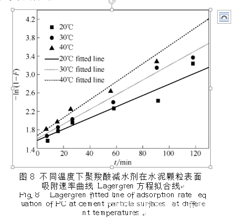 聚羧酸减水剂在水泥颗粒表面的吸附量随时间的变化曲线, 采用 Lagergren 吸附速率方程对该曲线进行拟合,并计算出吸附过程的吸附速率常数和表观活化能;研究了温度对该