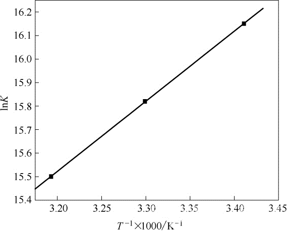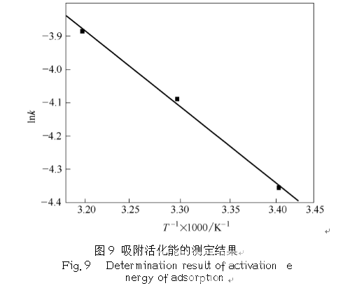 图9中该曲线的相关系数r2=0.9966,由此温度对吸附速率常数的影响是符合 Arrhenius 方程