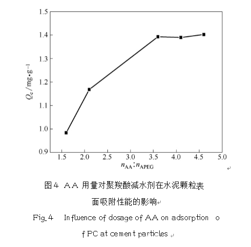 AA 的用量。AA 用量对聚羧酸吸附性能 (吸附量的测定是在20℃下) 的影响如图4所示。