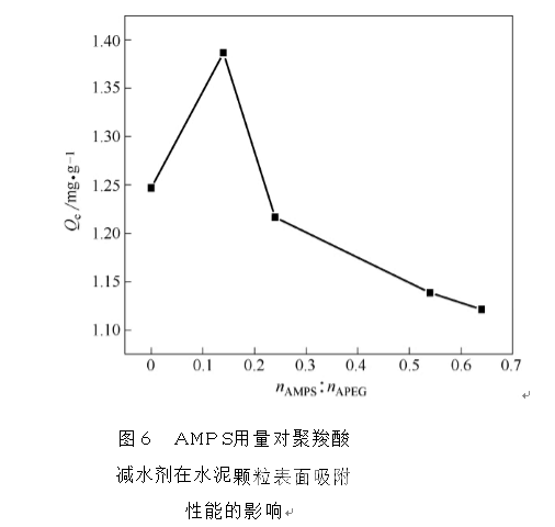 聚羧酸减水剂在水泥颗粒表面的吸附量呈现先增大后减小的趋势,在nAMPS∶nAPEG =0.14 时达到最大。分析认为,随 AMPS 用量的增大, 使聚羧酸分子中的阴离子电荷密度增加,吸附能力增强,从而使其在水泥颗粒表面的吸附量增加, 但是随着 AMPS 用量的继续增加,主链上支链密度降低,吸附在水泥颗粒表面的支链密度会下降, 从而使吸附量降低[13]。